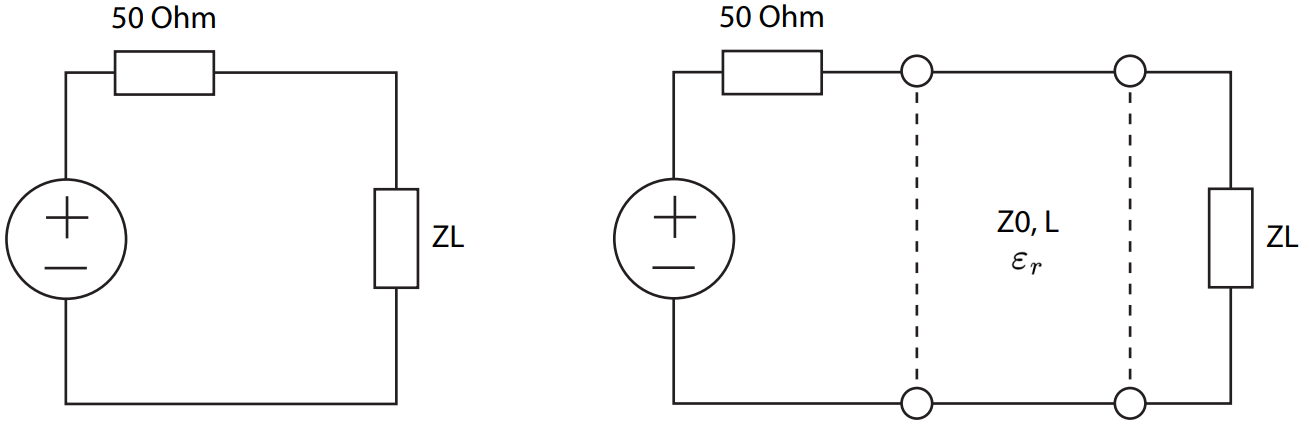 The right image shows a very similar circuit, but the connection between the source and the load is done through a transmission line. The only physical difference between both models is that we lift the electrostatic assumption. Let me explain why.