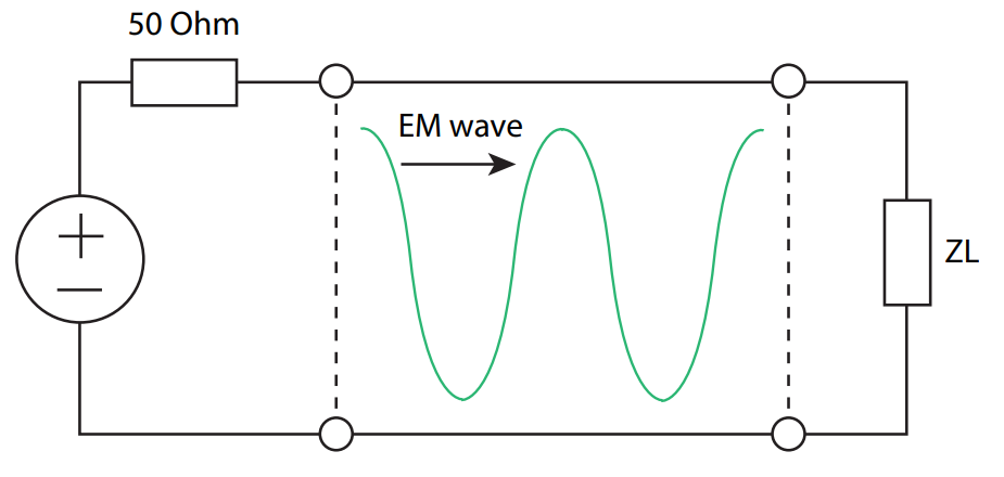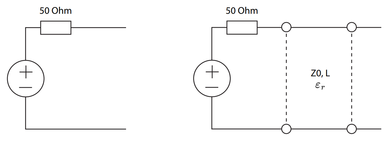 If the signal generated by the source is fast-changing, it takes finite time to travel through the line. The voltage of the conductor doesn’t have time to settle, forming a travelling wave. Since the wave propagation is not instantaneous, we need to take into account the line length L and the signal propagation speed characterized by the relative permittivity $\varepsilon_r$. That’s when the transmission line model comes in hand.